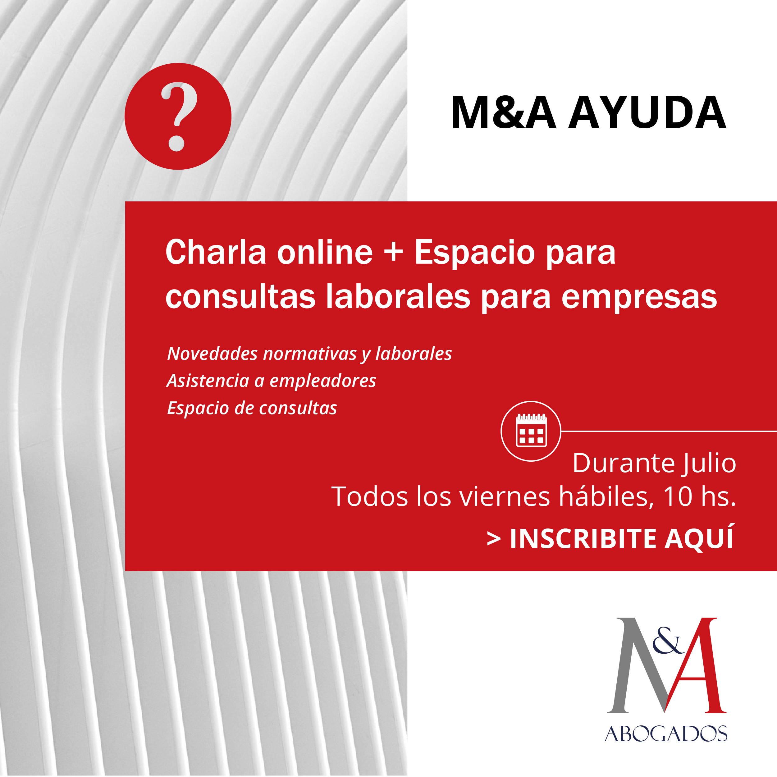 Es en este marco que decidimos implementar el programa “M&A Ayuda”: una nueva forma de comunicarnos y asistir a los empleadores de forma regular mediante talleres remotos de asistencia donde los profesionales del Estudio M&A trataremos las novedades normativas y laborales del momento, así como también se atenderán consultas y dudas que las empresas puedan tener.